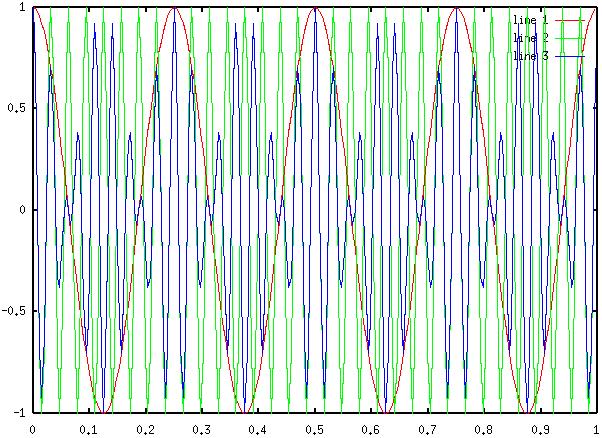 6) Diagram 6: Octave output for 32Hz sinewave, 4Hz sinewave, and the resulting waveform of the two multiplied together.