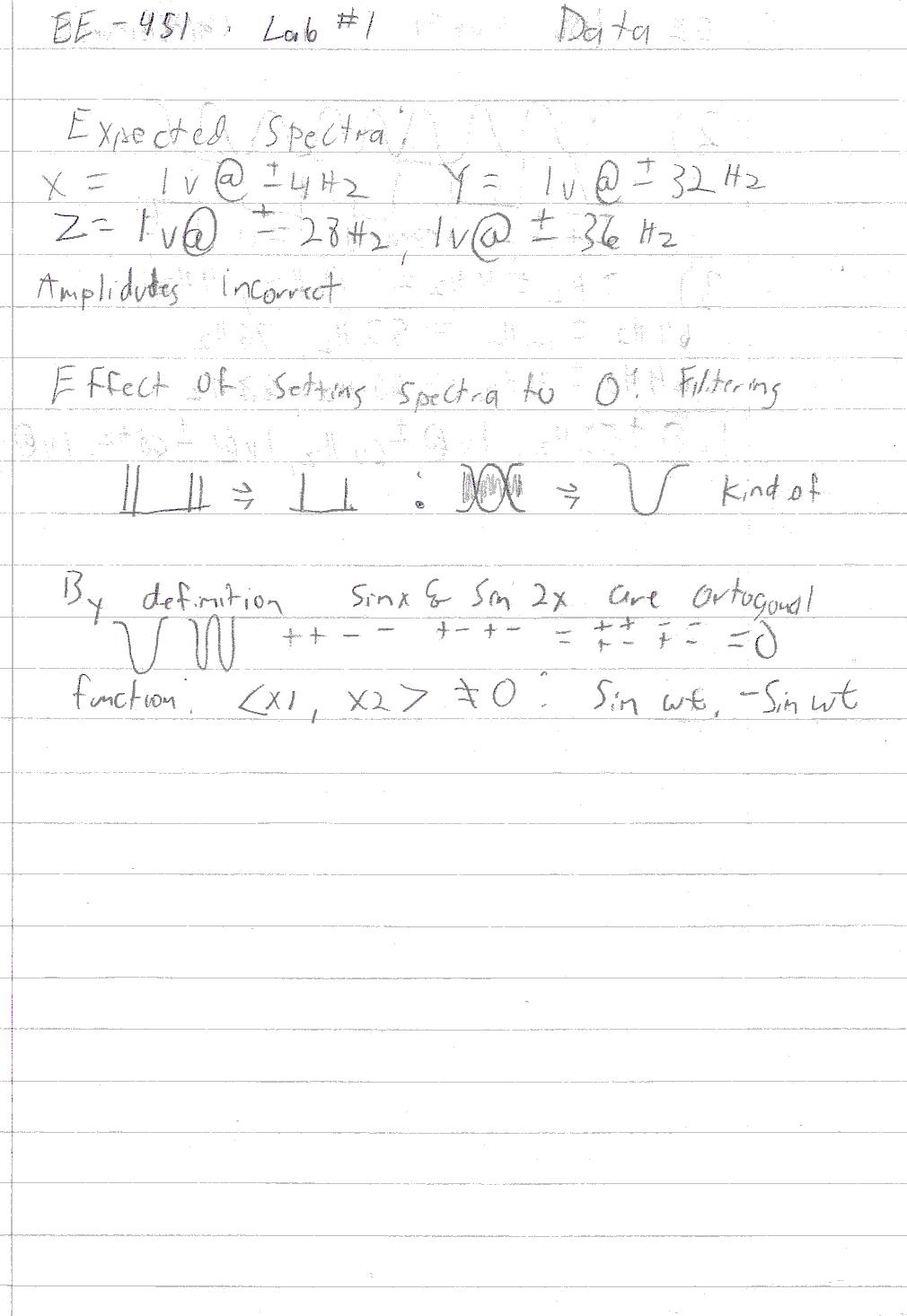 This lab has demonstrated the basics of the MatLab command set. I do not have the ability to run MatLab on any computer, so instead, I chose to run a combination of SciLab and GNU Octave. I found that the Octave had more inherent variables (pi, etc) and was slightly more accurate, and had syntax closer to MatLab, but SciLab had a lot more functions, including those that interfaced with the system DSP. For the exact command structure, please refer to the attachments.