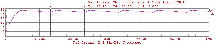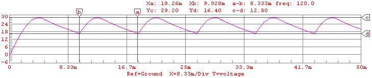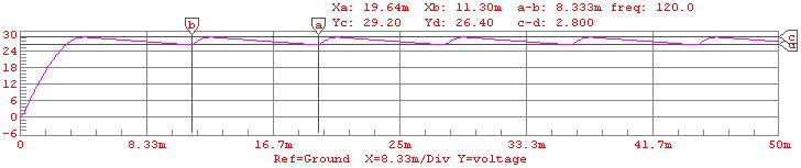 This lab has demonstrated the basic operations of a simple full wave bridge, or peak rectifier. The results were good and were predictable. One note is that the data from the simulations predicts a stable operating point (<2V ripple) at around 1KW, which is expected form the calculations in question 2. I have performed this lab many times in a practical sense when I designed and built power supplies. With a 16W load using a LM317 driven by a power transformer rated at 3A @ 15VACRMS, I was able to achieve less than .1V ripple using 2 2200mF capacitors and a 1000mF on the output.