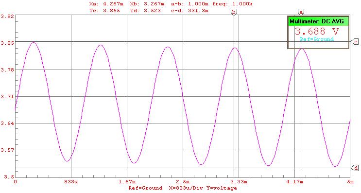 2) Simulate the circuit and obtain the DC average values for base and collector current, and the voltage gain.