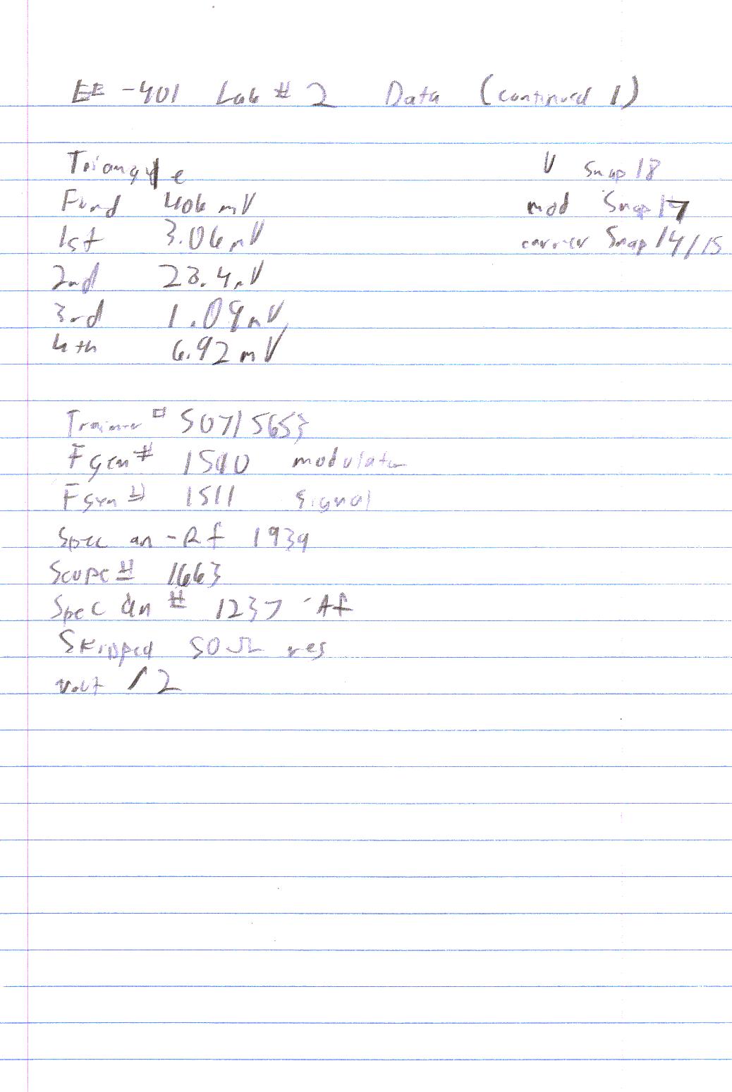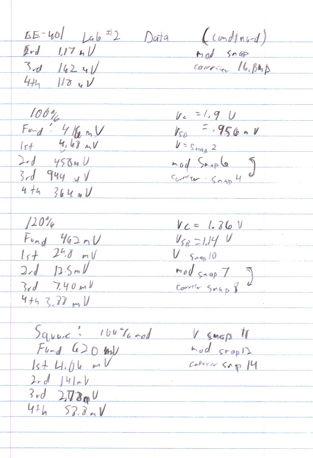 This lab has demonstrated some of the basic principles of DSB-FC modulation. Significant problems in the lab involved the fact that there wasn't a function generator capable of putting out a signal with enough voltage to obtain the required voltage. As a result, all specified voltages were divided by two during the actual experiment. Also, the generators were not designed for 50W loads, instead they were Hi-Z outputs (S100KW). As a result, the 50W resistor from the diode input to ground was removed during the experiment. Also, calculations are not compensated for harmonic distortions inherent to the function generators. That was somewhat discussed in the explanation of question 3. Other than that there were no other difficulties with this lab.