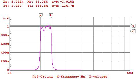 This lab has demonstrated that a 10th order band pass filter can be designed from a 5th order design. Here we used the Chebyshev filter as a template, however, any filter bas can be used if the proper transforms and scaling factors are applied. The primary difficulty with this lab was realizing that the scaling factors were in radians/second. Therefore, I had to apply an additional 2p scaling factor. After several attempts, I got the circuit functioning properly. The inconsistencies in the bandwidth are most likely a result from inaccuracy of the markers. The inconsistency in the ripple, which should be <.5dB is because the simulation reported a gain at certain frequencies which is not directly possible. Using 1 instead of the reported maximum yields a .490dB ripple in the passband. Overall, I believe that this lab was successful.