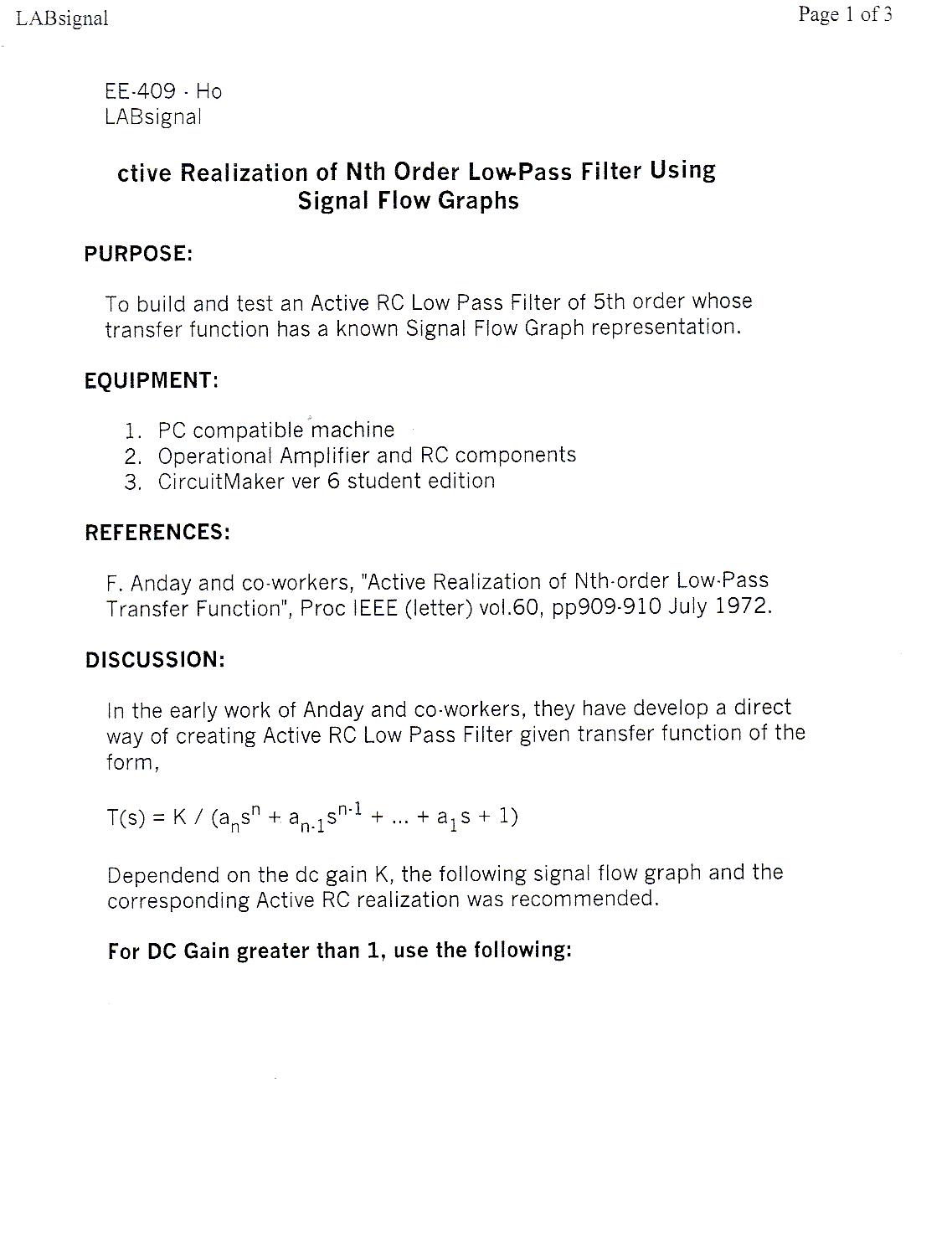 Lab #3: Active Realization of Nth Order Low-Pass Filter Using Signal Flow Graphs