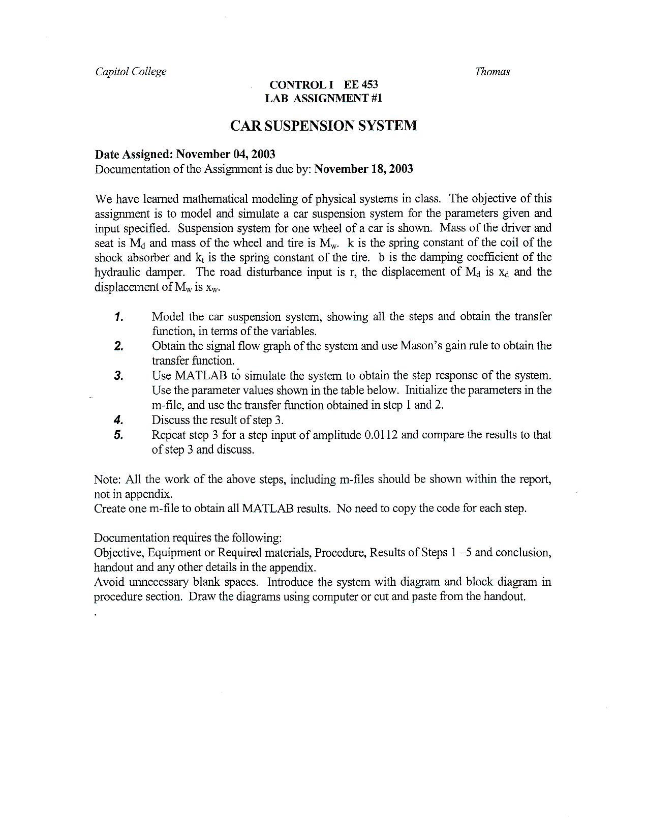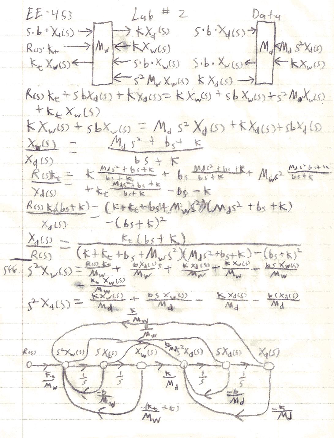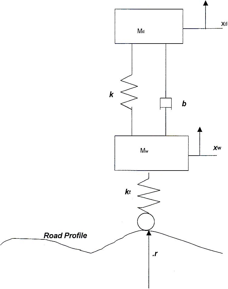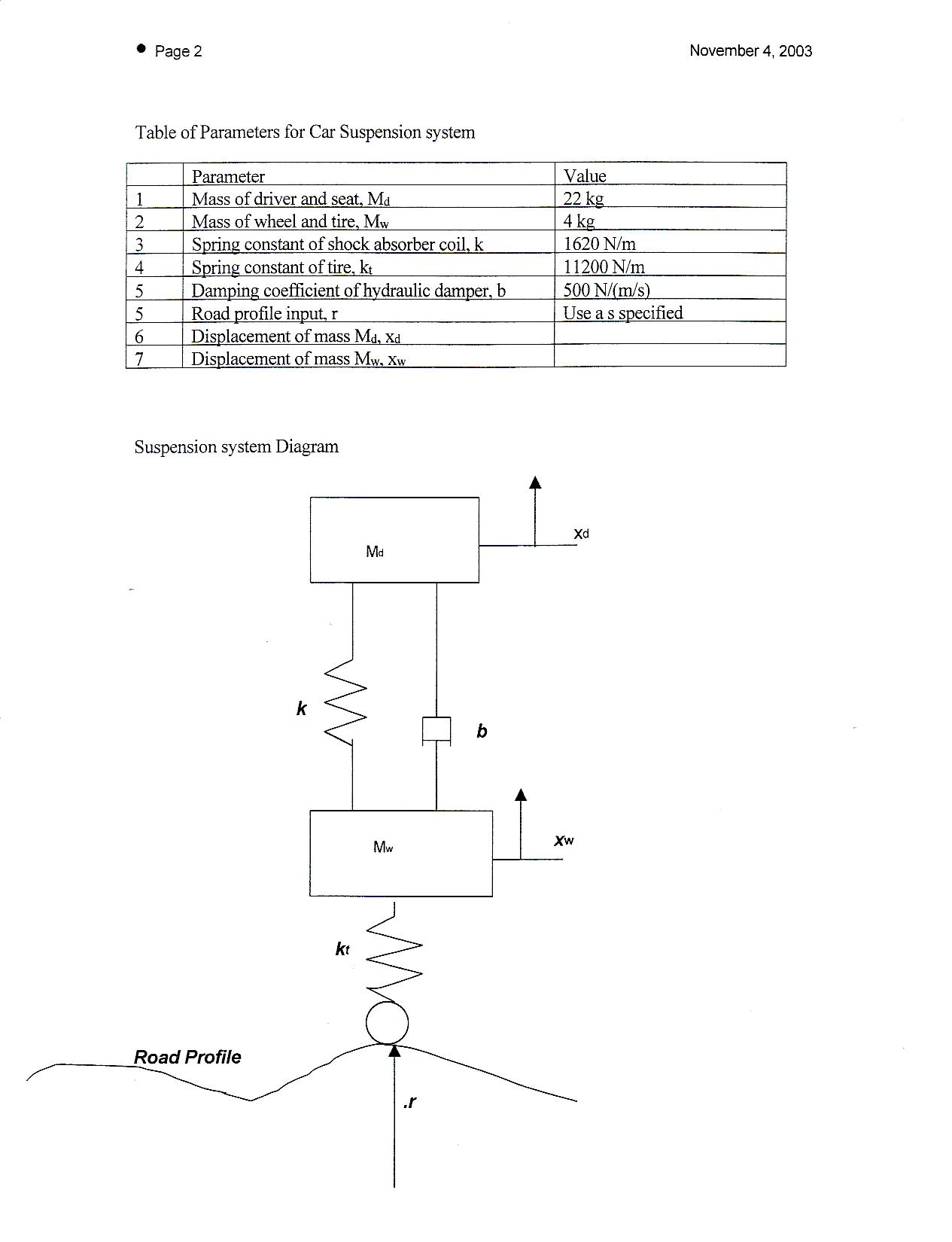 The objective of this lab is to model the suspension system of a car over an arbitrary terrain using MatLab® or similar software. The various coefficients for the system will be given. The system will be modeled and a transfer function will be obtained both directly and by using Mason's Gain Rule. A unit step function will be applied to the system modeled in MatLab® and the resulting displacement of the wheel and vehicle will be observed.