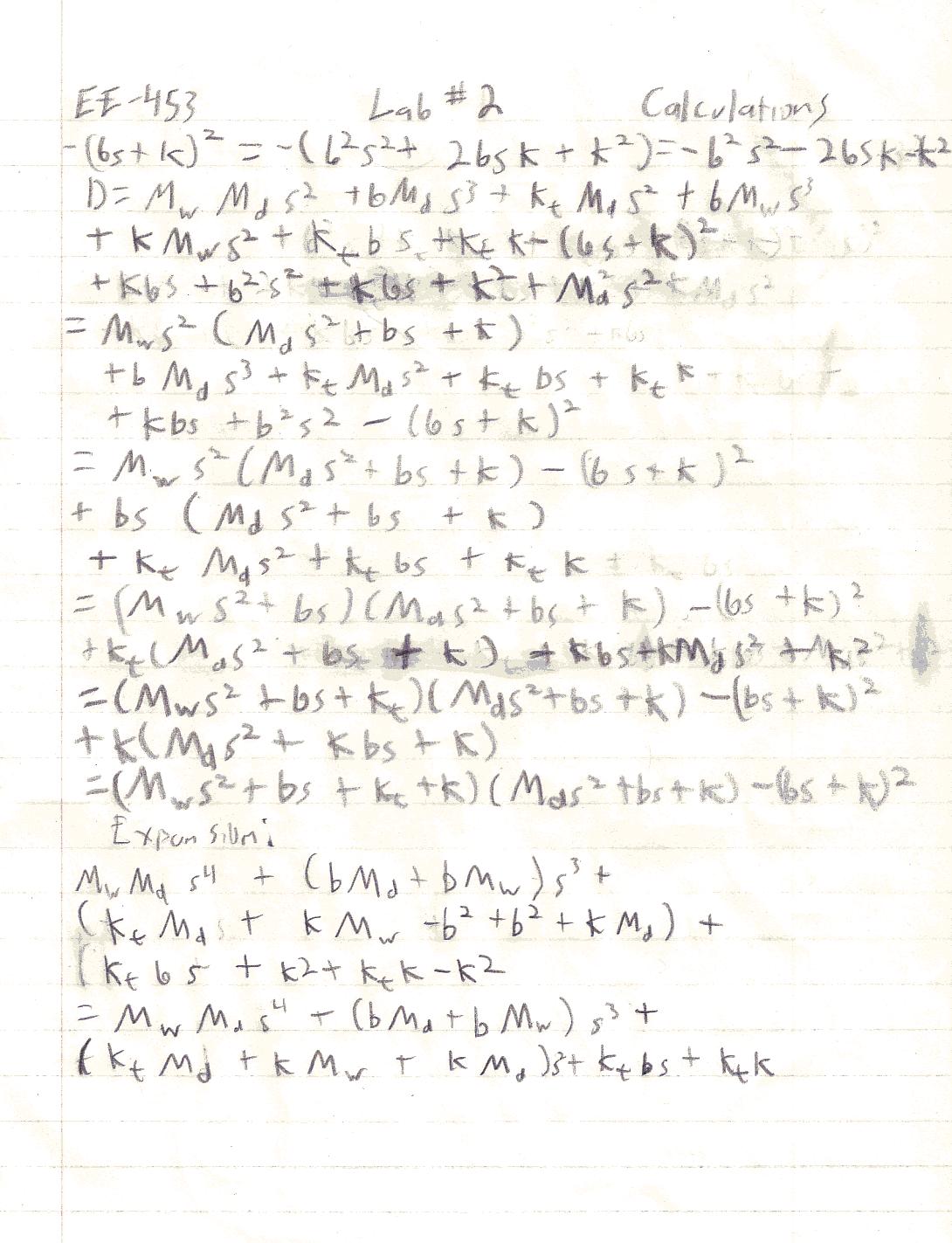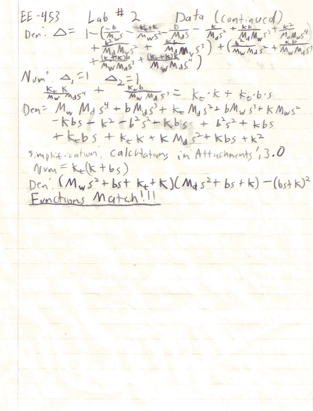 This lab has demonstrated that a system may be modeled both through Mason's gain rule as well as through the use of force diagrams. The transfer functions, after a significant amount of work, can be show to be equivalent. (Please refer to Attachments 3.1). Additionally, programs like MatLab® can be used to simulate the system. The effect of applying a .0112 unit step in step 6 caused a scaling factor to be applied to the transfer function. This in turn, scaled the responses. Although otherwise identical, the response was significantly smaller. This corresponds to things observed today. If you hit a large curb you're in for much more of a rough ride than if you roll over a small rock.