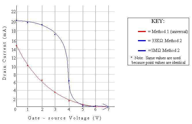 From this lab it is concluded that the value of the resistor attached to the gate input of a JFET has no effect on the operation of the JFET. I would like to comment that I took the opportunity to calculate ID using two different methods: The first was the expected one using Shockley's equation. The second method was to calculate the voltage drop across the drain resistor and, using that value, calculate the resulting current. I was surprised at the difference in results, however i do believe that the results given from the second method are more applicable and yield a more accurate curve. The curve yielded is also closer to the actual curve expected from a JFET transistor.