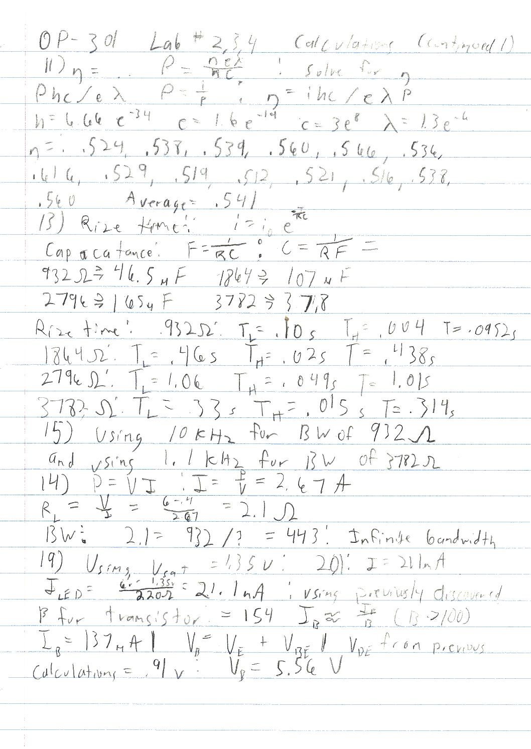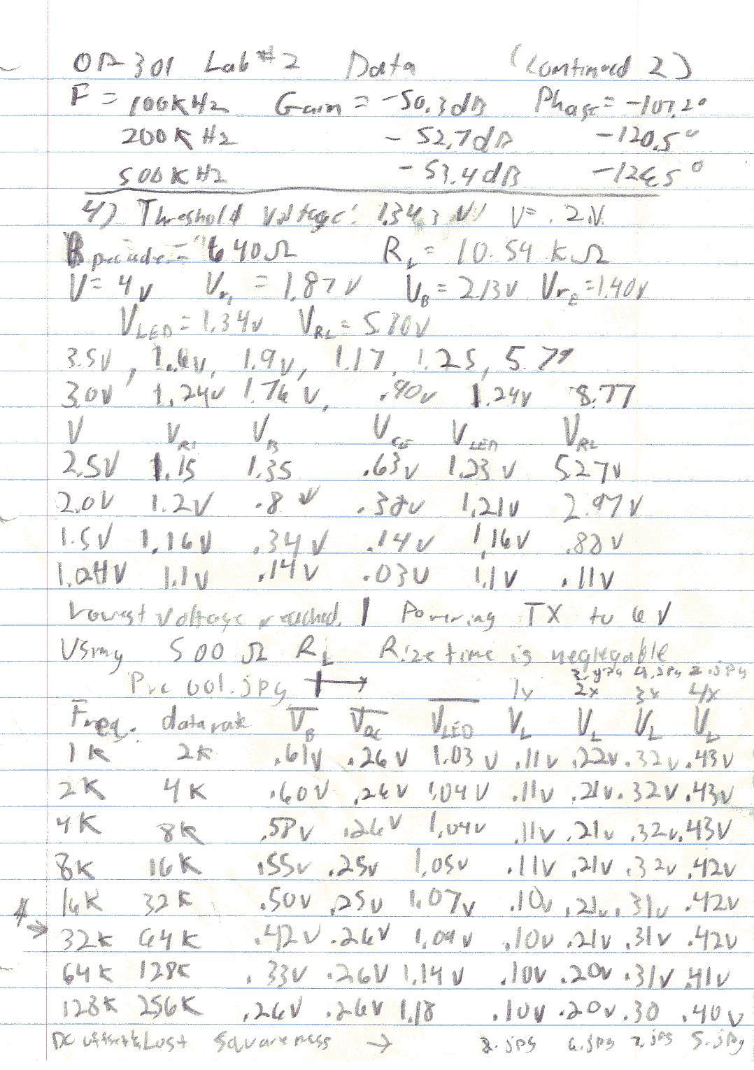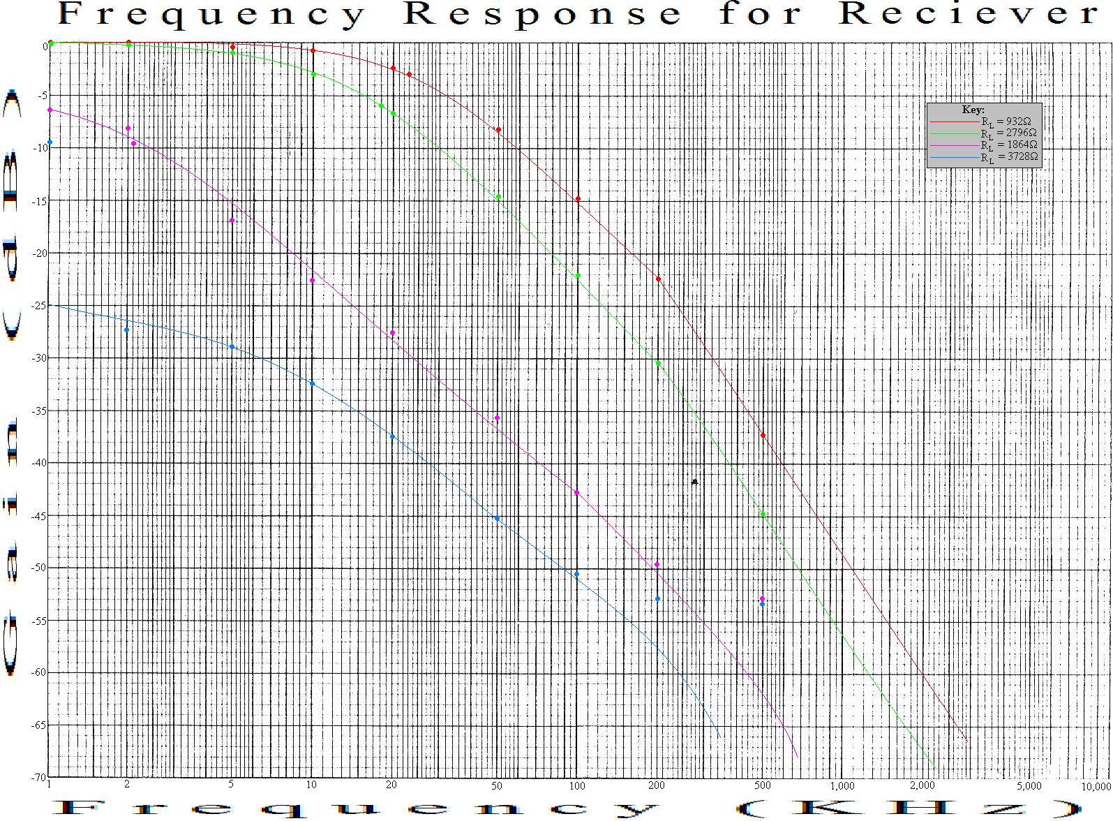 This lab has demonstrated the basic principles surrounding a basic fiber-optic communications system. However, this system does not accurately model the actual world. The equipment used was horrible out of calibration and there were many difficulties associated with the lab. Primarily a 220W resistor was substituted for the 110W resistor in the schematics. Although the direct impact on the lab was mostly easily compensated for, it could explain some of the radical errors observed in the data sets. The analog measurements have little to no foundation and were not reproducible. The reason for this is as of yet, undiscovered. The system, overall exhibited a high level of loss, uncharacteristic of a fiber-optic system. Much of the loss is most likely as a direct result of equipment being out of calibration. This may explain the radical readings observed in the analog section. The analog section suggested two possible data sets. One involving the 3.7KW and 930W load resistance, and one involving the 1.7KW and 2.7KW load resistance. There is insufficient data to support or disprove either of these two systems. As a result, calculations were made in sets to show the most accurate representation of the data possible. The digital system represented a much more accurate set of readings. However, the maximum data rate calculation is uncertain. The observation was made based on the requirement of a PECL quantizer being placed at the receive end which requires only a rise-and-hold time to determine a 1 or 0 state. For this, 1% of the wave time was used. Additionally, since the low output resistance was used, the rise and fall times were unable to be read. On the oscilloscope they appeared as a perfect straight line. However, it would have been possible to make a more accurate measurement had the time base been properly adjusted. Unfortunately, this was overlooked. Also, the lab handout schematic calls out a 220W resistor to be placed in series with the LED. This was omitted to have a higher power output and to be compatible with other readings. It was also omitted to help compensate for the increase in emitter resistance. As a result, RE voltage was read in lieu of RC. It would be interesting to see if the capacitive effect of the photodiode could be reduced if the phototransistor was arranged in a common-collector or Darlington configuration as opposed to a common emitter.